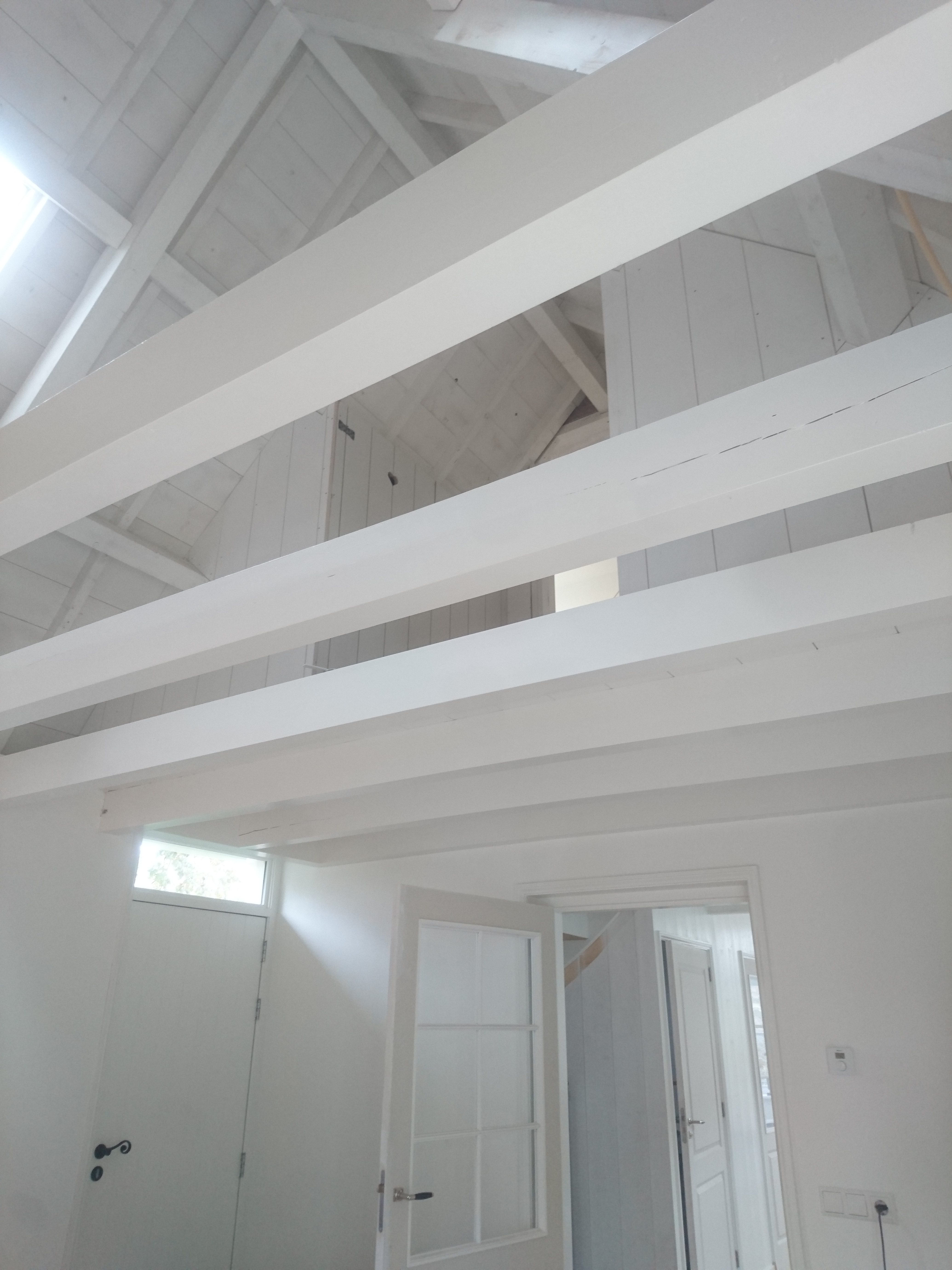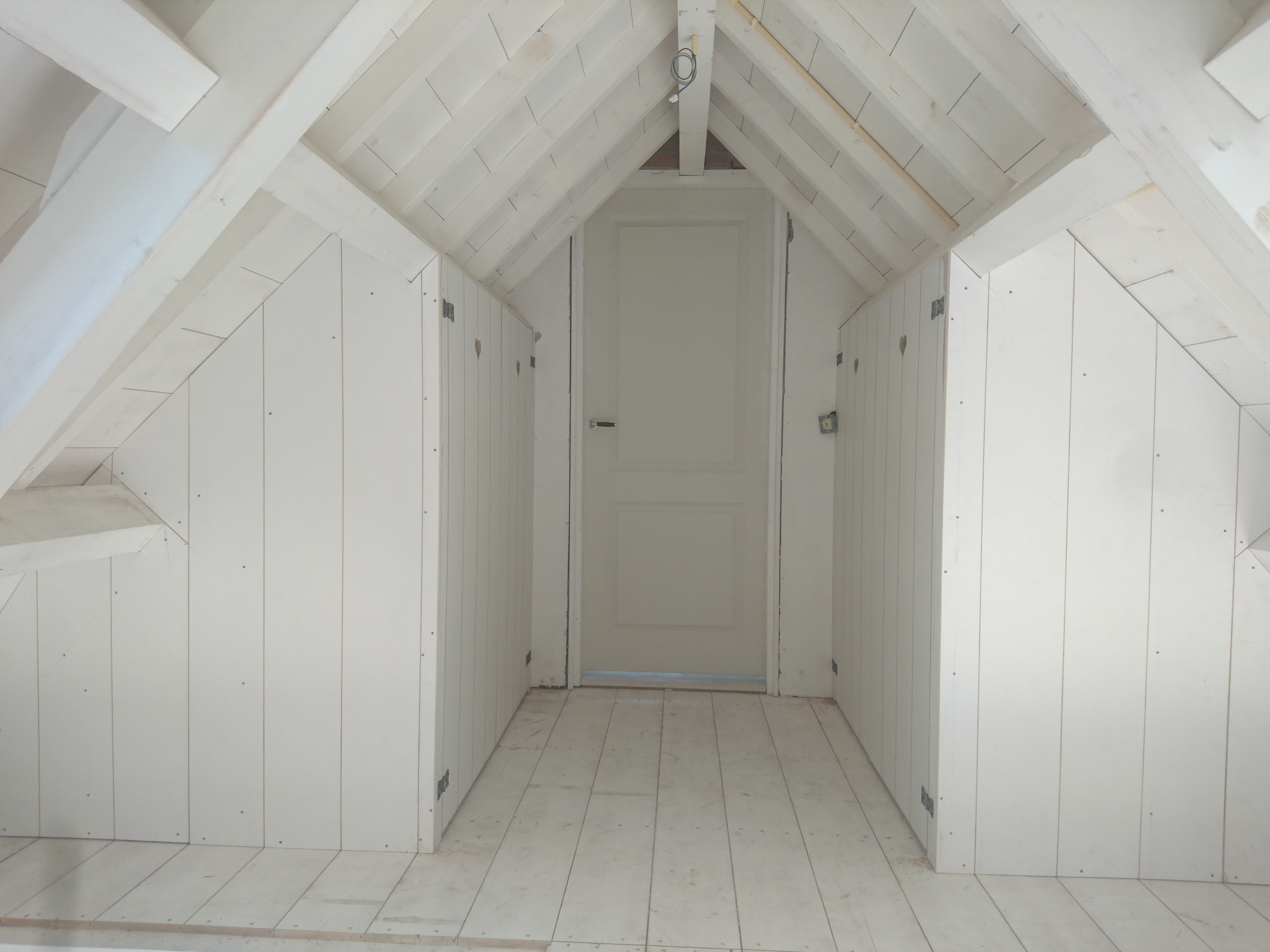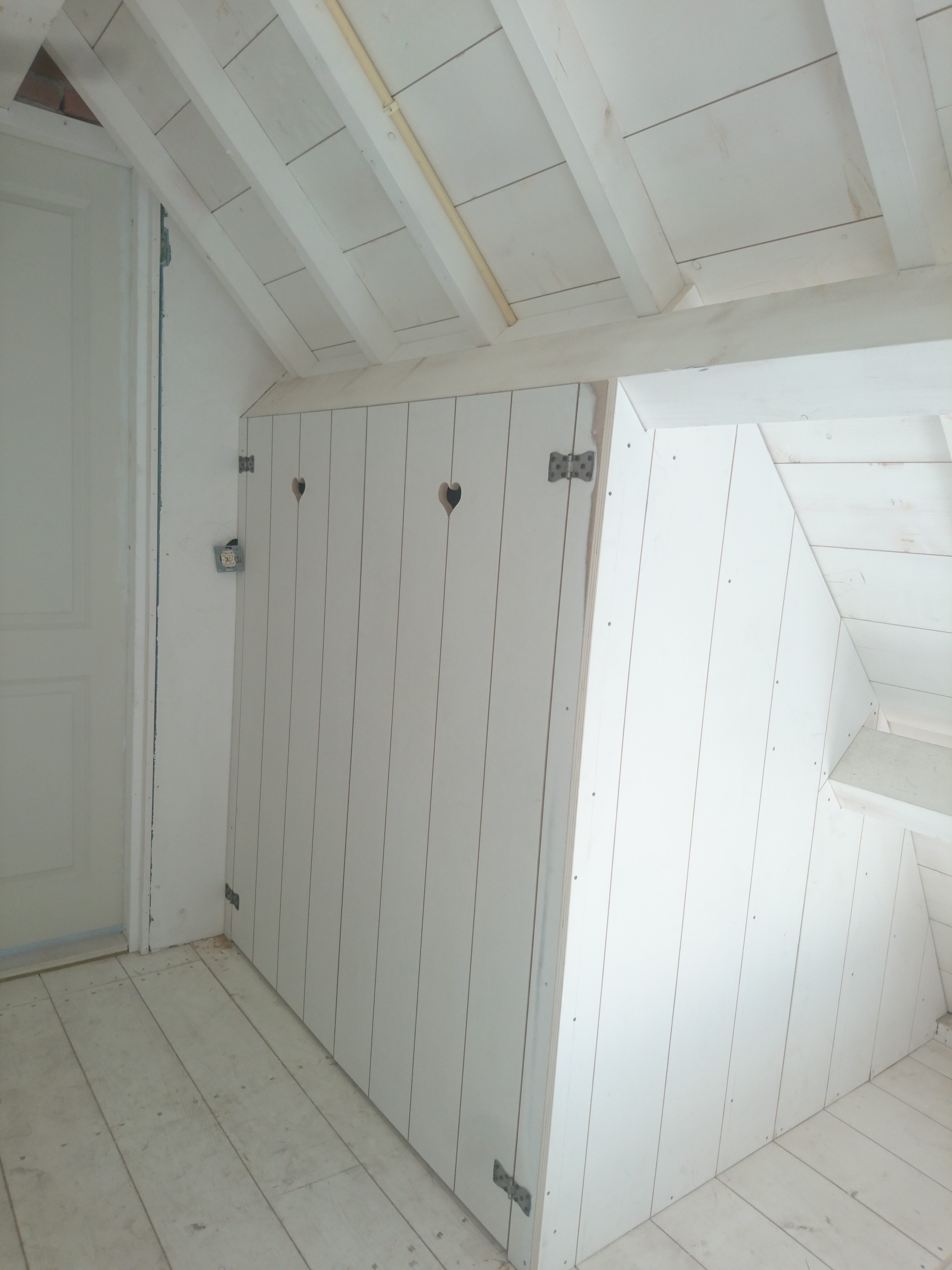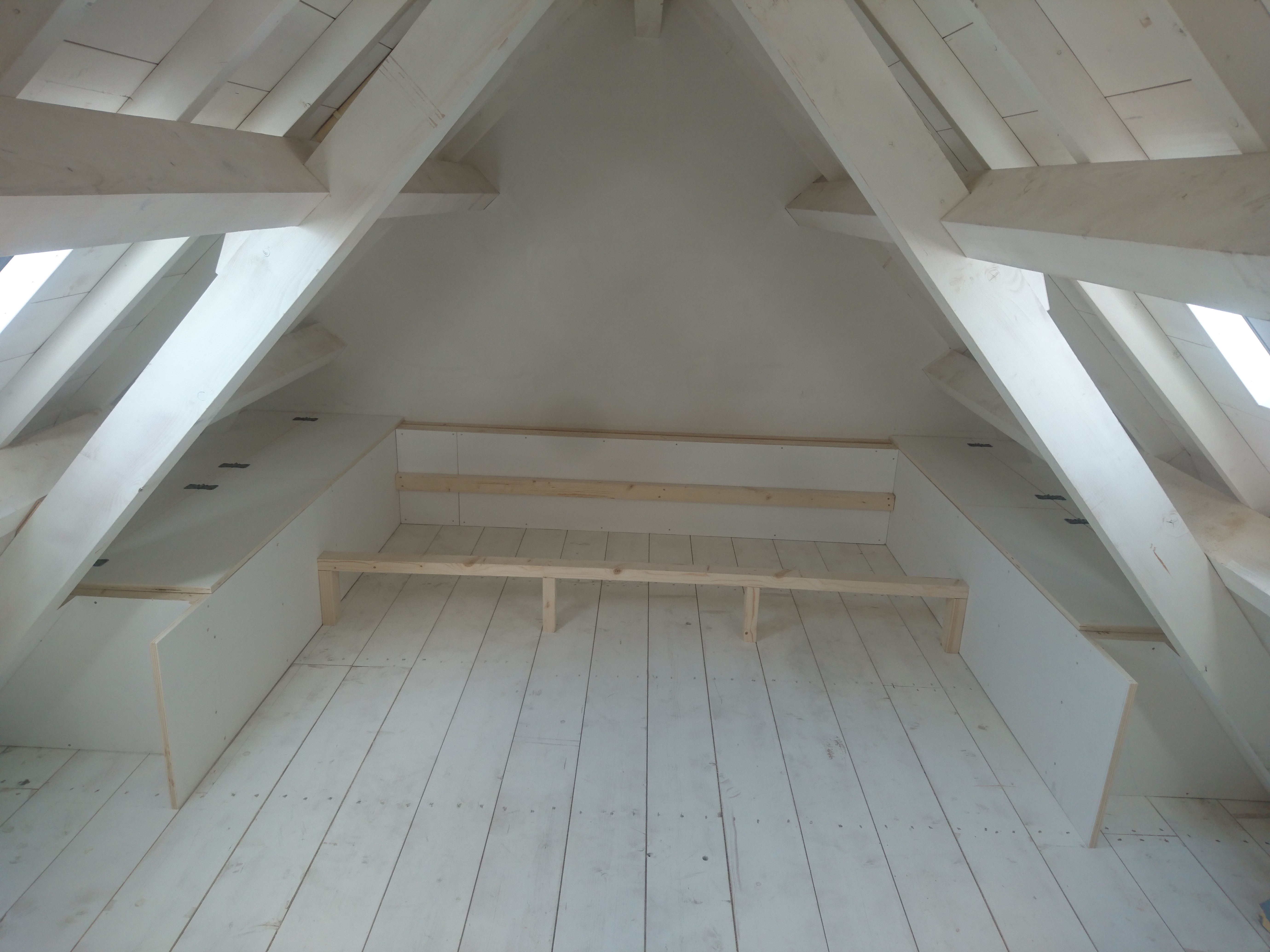 Onder een schuin dak tussen de spanten een bedstee op maat gemaakt, met onder de eerste lattenbodem een la en aan het hoofd- en voeteneinde luiken met daarachter bergruimte.
